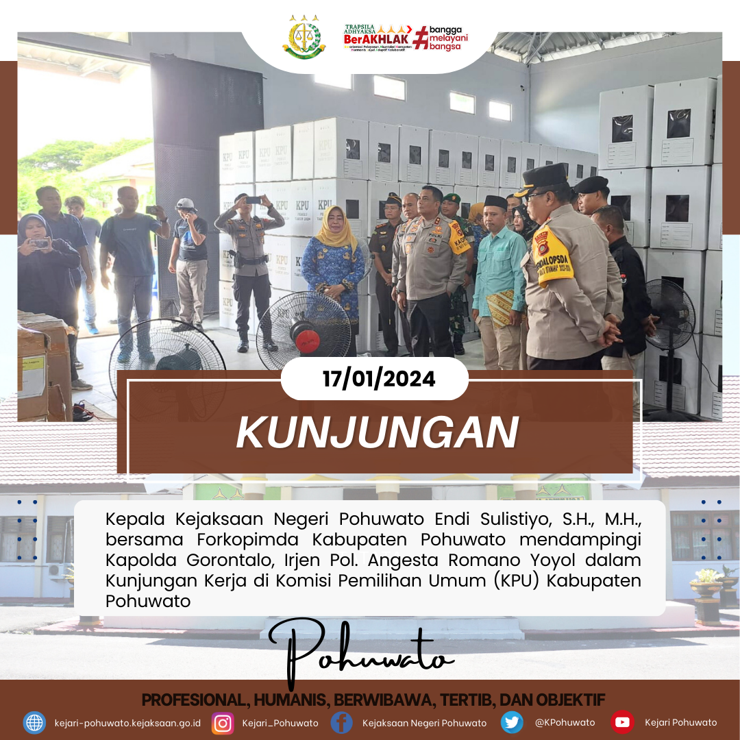 Kepala Kejaksaan Negeri Pohuwato Endi Sulistiyo, S.H., M.H., bersama Forkopimda Kabupaten Pohuwato mendampingi Kapolda Gorontalo, Irjen Pol. Angesta Romano Yoyol dalam Kunjungan Kerja di Komisi Pemilihan Umum (KPU) Kabupaten Pohuwato terkait kesiapan pelaksanaan Pemilihan Umum (Pemilu) Tahun 2024 di Kabupaten Pohuwato.
